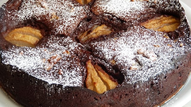 Retirer l’emballage des chocolats et les faire fondre au bain-marie. Retirer le chocolat du bain-marie et mélanger avec les 50g de beurre restant pour obtenir une crème lisse Fouetter les œufs avec le sucre puis ajouter le chocolat tout en fouettant et la farine avec la levure. Ajouter les noix mixées grossièrement, les poires épluchées et coupées en morceaux en réservant quelques quartiers pour la finition. Enfourner pour 50 à 55 min. Sonder le centre qui doit rester moelleux. Laisser refroidir, démouler et mettre le gâteau au réfrigérateur. Attendre minimum 2 h avant de le savourer