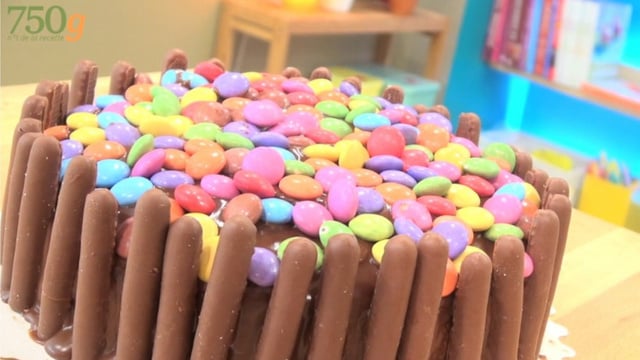 Recouvrez le tour du gâteau avec les fingers (coupez-les au préalable s'ils sont trop hauts par rapport à votre gâteau) puis parsemez le dessus du gâteau avec les smarties.