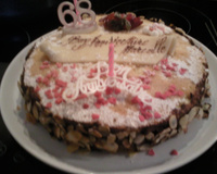 Génoise aux amandes fourrée à la mousse au chocolat et à la poire.