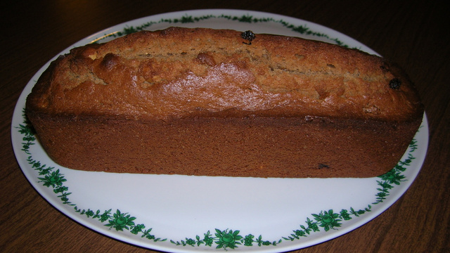 Y ajouter les farines, les raisins et les noisettes. Mélanger et verser dans le moule. Cuire 35/40 min, vérifier la cuisson au couteau.