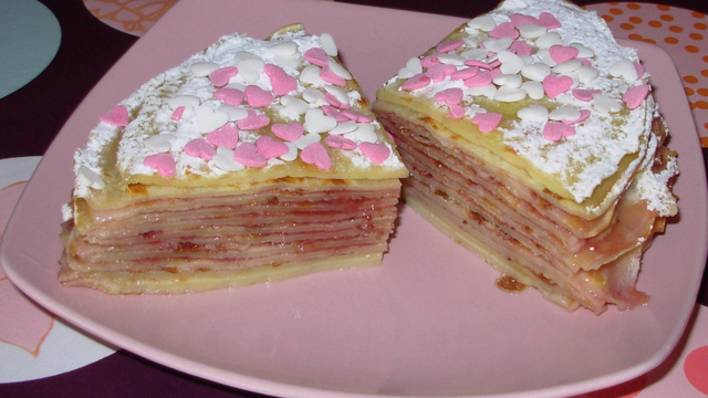 Pou les fans de crêpes, ce gâteau va vous plaire ! La fleur d'oranger se marie à merveille avec la confiture de fraise. Un délice !