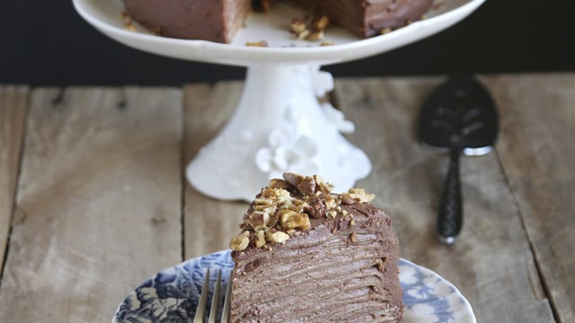 Un gâteau de crêpes au chocolat, avec une crème pâtissière au chocolat, un dessert ultra gourmand.