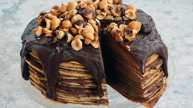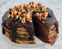 Nous avons craqué pour ce gâteau de crêpes très facile à préparer. La garniture est une ganache montée pour les amoureux de chocolat. Nous l'avons agrémenté de noisettes torréfiées pour apporter du croquant. Une belle gourmandise pour la Chandeleur.
