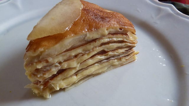 Une recette pour les enfants le jour du carnaval. Une superposition de crêpes, fines tranches de poires et crème à la vanille maison.