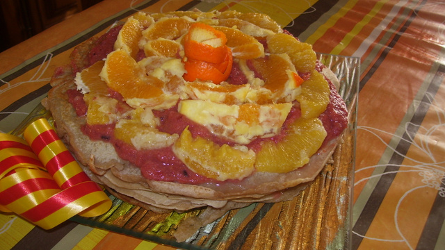 Après avoir fait les crêpes, étaler entre chaque crêpe une couche de confiture d'oranges ainsi de suite jusqu'à la fin du nombre de crêpes