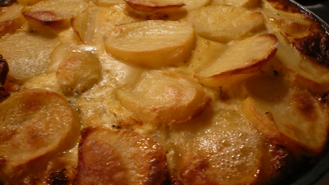 Beurrer le fond et les bords d'un moule rond et haut, en verre si possible, de 20 cm de diamètre environ. Et alterner les couches: un tiers des pommes de terre (pelées et coupées en tranches de 3 millimètres environ). Saler, poivrer. - 3