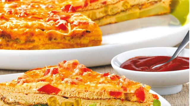 Le gâteau d'omelette repensé par Amora avec du maïs croquant, des poivrons revenus avec des oignons et des pommes de terres fondantes. Recette facile pour le dîner, accompagné d'une salade verte.