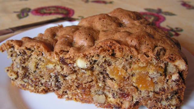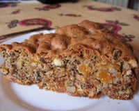 Battre en mousse le sucre et les œufs. Ajouter le zeste de citron. Incorporer la farine tamisée avec la levure. Ajouter tous les fruits secs et la cannelle.
