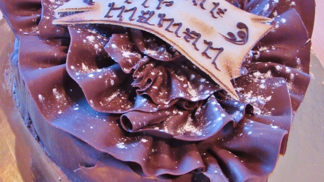 Pour la fête des mères un superbe gâteau composé de mousse chocolat et de meringue. Décor de copeaux chocolat.
