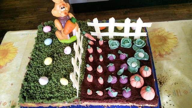 Cassez la mousse à l'orange pour l'étaler facilement sur la dacquoise. Placer au froid pour que cette mousse fige. Posez la mousse au chocolat, étalez la bien à plat. En vous aidant de caches en papier sulfurisé, saupoudrez vos biscuits en poudre pour dessiner le jardin, faites à votre idée. Légumes en pâte d'amande : Vous pouvez les préparer plusieurs jours à l'avance et les conserver à température ambiante. ! La base est toujours la pâte d'amande blanche. Carotte et citrouilles: colorant jaune + colorant rouge. feuilles des betteraves, tiges des citrouilles, choux, salades : colorant vert (ou bleu + jaune si vous ne trouvez pas de vert). betteraves : colorant rouge + colorant noir (un tout petit peu). Pour éviter que la pâte d'amande ne colle sur votre plan de travail et sur vos doigts, fleurez le avec du sucre glace. Pour le modelage aidez vous de petits outils (baguette chinoise, fourchette plastique, spaghetti...).