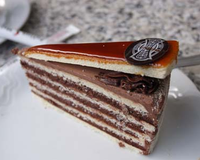 C'est un gâteau très parfumé au chocolat, qui alterne six fonds de tarte et la crème, le tout étant recouvert d'un glacage au caramel.