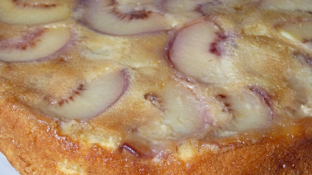 Bien laver les pêches et les essuyer. Les couper en tranches de 1 à 2 cm d'épaisseur et en recouvrir le fond du moule. Verser délicatement la pâte, et mettre les autres pêches en les enfonçant un peu avec le doigt. Enfourner pour 30 min. Démouler le gâteau une fois refroidi.