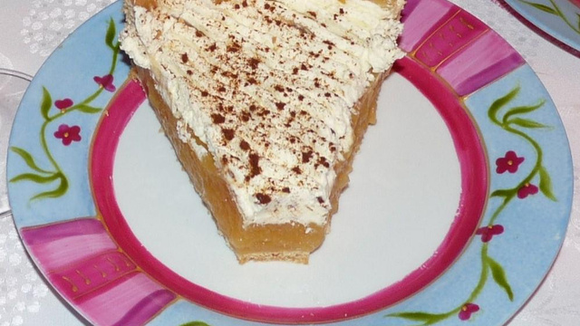 Laissez refroidir pendant 2-3 heures et préparez la chantilly. Battre la crème avec la cremfix et disposez sur le gâteau. Faire des vagues avec une cuillère dans la chantilly et saupoudrez de cannelle moulue !