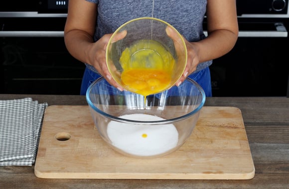 3Versez le sucre dans un saladier, ajoutez les jaunes d’œufs.