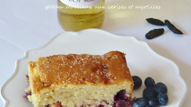 Un délicieux gâteau aux myrtilles et cerises que j'avais congelées l'année dernière, le tout parfumé avec le Kirsch maison et fève Tonka, un régal.