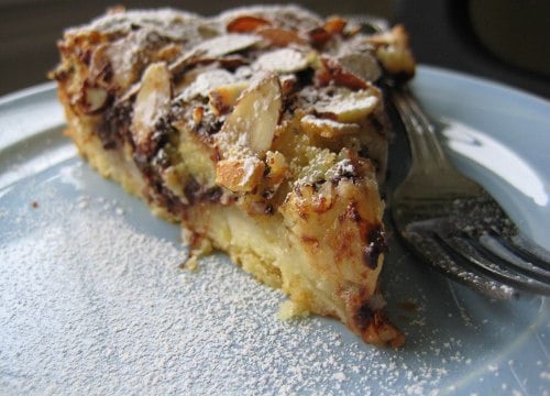 Parsemez le gâteau prêt à cuire avec les poires et le reste des pépites de chocolat.
