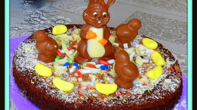 Laisser refroidir et avec un pinceau badigeonner le dessus et les cotés avec du sirop de vanille, saupoudrer de sucre glace et décorer avec des oeufs et des lapins en chocolat, des copeaux de chocolat blanc, des vermicelles en chocolat, et des bonbons.