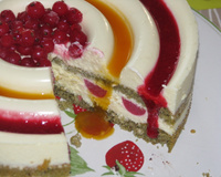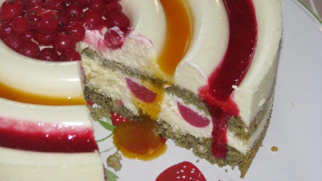 Pour la déco finale, verser un peu de coulis (ici fruits rouges et abricot/mangue) dans les anneaux et dans le rond central des groseilles.