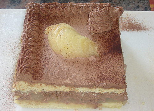 Dans un plat, poser le cadre, y déposer un rectangle de génoise coupé en 2 , garnir des lamelles de poires au sirop (réserver 1/2 poire pour la décoration), recouvrir de ganache chantilly, mettre le 2ème rectangle de génoise et la ganache. Lisser avec une spatule. - 4