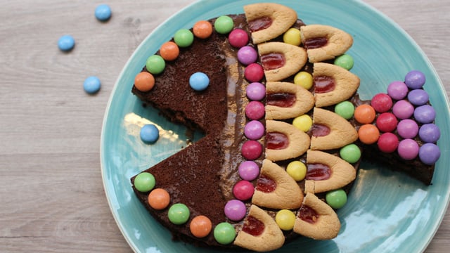 Décorer ensuite le gâteau avec les biscuits barquettes coupés en deux pour représenter les écailles et les Smarties.
