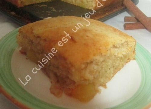 Préchauffez le four à 180°C. Épluchez et coupez les pommes en dés. Mélangez la farine, les amandes en poudre, le sucre, la levure et la cannelle. Ajoutez la margarine fondue et le lait petit à petit. Placez les dès de pommes dans le fond de votre moule et versez la préparation dessus.