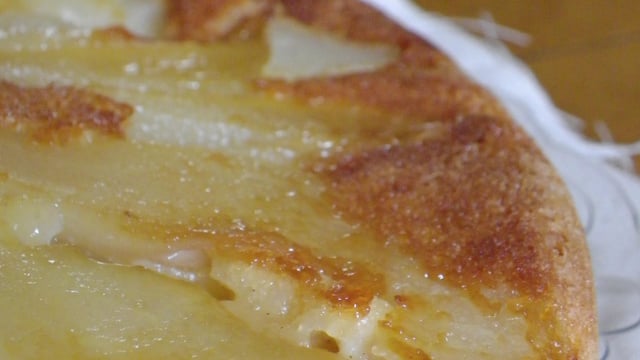 Peler les poires et les couper en 4. Retirer le trognon et couper chaque quart en 3 à 4 tranches. Disposer les tranches de poires en rosace dans le plat. Recouvrir de pâte à gâteau et enfourner 30min.