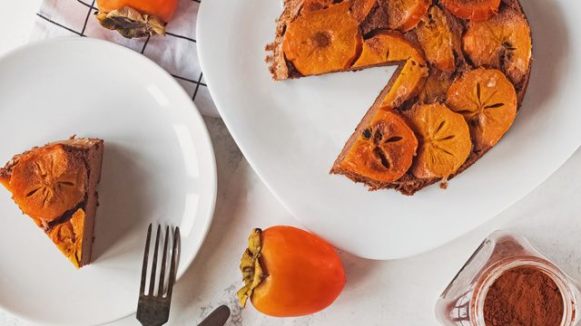 Préchauffez votre four à 165°C, huilez un moule rond de 24 cm de diamètre puis tapissez le fond et les côtés de papier sulfurisé. Tapissez le fond avec les tranches de kakis.