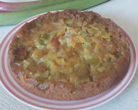Dans le bol du Thermomix mettre 90 g de beurre pommade, 120 g de cassonade et programmer 8 sec V5. Ajouter 3 oeufs, 180 g de farine, 6 g de levure chimique, le sucre vanillé, le lait de coco programmer 20 sec V4. Mettre cette préparation sur la rhubarbe et cuire 35 mn.