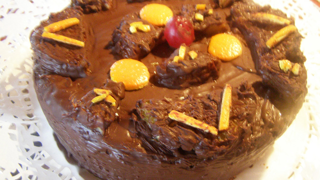 Etaler ce glaçage sur le gâteau. Décorer d'oranges glacées au chocolat.