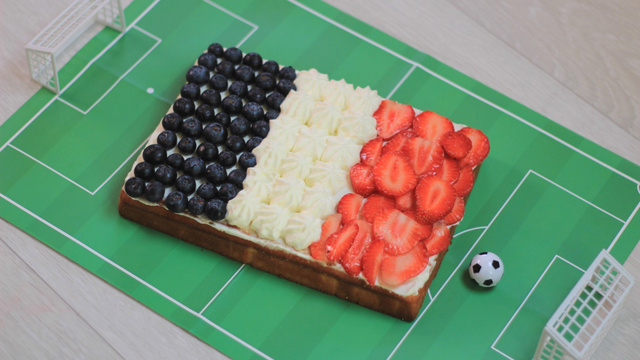 A l’aide d’un couteau à pain, retirez le dessus du gâteau, afin d’avoir un rectangle plat. Mettez un peu de chantilly sur la surface du gâteau et étalez à l’aide d’une spatule coudées. Disposez les myrtilles à gauche, les fraises à droite et la chantilly en mini-rosaces.