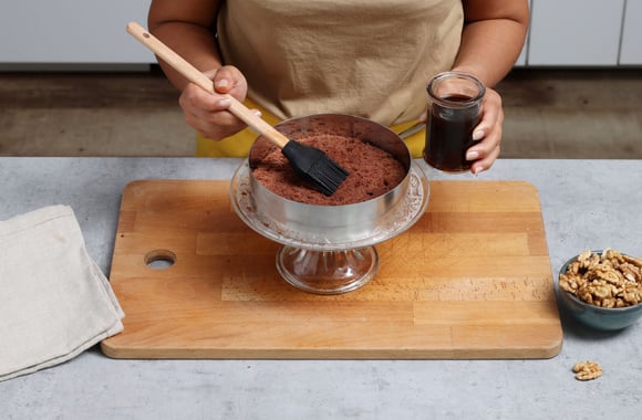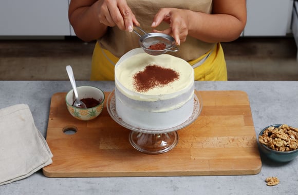Déposez le troisième disque à génoise puis badigeonnez-le de crème mascarpone et saupoudrez la surface de cacao en poudre.