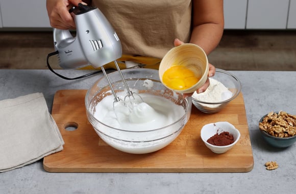 Séparez les blancs d'œufs des jaunes. Montez les blancs d’œufs en neige très ferme.