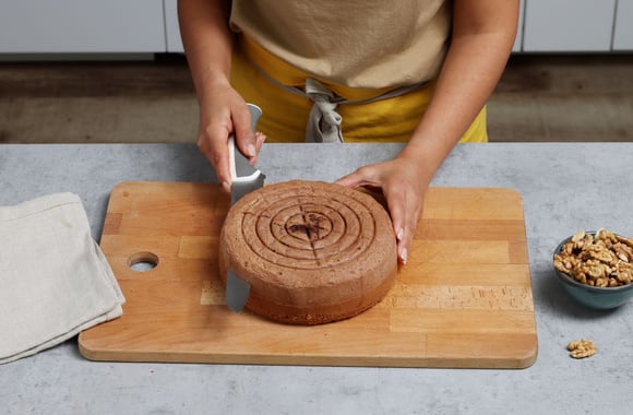4Une fois cuite, démoulez la génoise et laissez-la refroidir sur une grille. Puis coupez-la en trois parties dans le sens de l’épaisseur à l’aide d’un grand couteau.