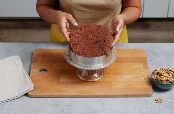 Mettez le premier disque à génoise dans un cercle à pâtisserie.