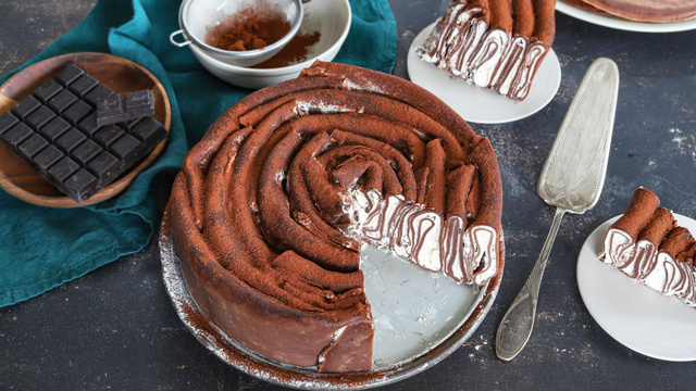 Pour raccourcir les temps de préparation de ce gâteau, vous pouvez préparer les crêpes à l'avance, un à deux jours avant la préparation du gâteau. Dans ce cas, après avoir fait refroidir les crêpes empilées sur une assiette plate, couvrez-les avec du film alimentaire et réservez-les dans le réfrigérateur. Sortez-les du réfrigérateur une demie-heure avant de les utiliser pour préparer le gâteau.