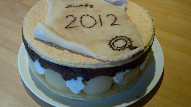 Le lendemain, décorez de pâte d'amande ( ici, un parchemin, vieillit avec un pinceau et du cacao amer, et l'écriture en chocolat fondu).