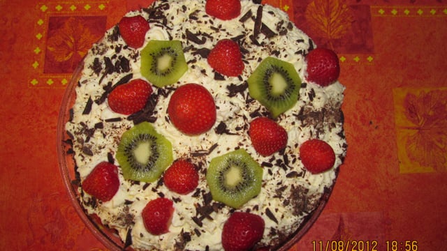 Fraises, nettoyer couper en morceau pour mettre dans le gâteau au dessus de la crème pâtissière .Laisser quelque fraise coupé pour décoré le bord du gâteau et le dessus.