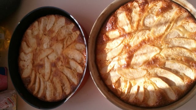 - 2Verser la préparation dans un moule rond.La derniere pomme sera coupée en quartier et recouvrira la préparation.