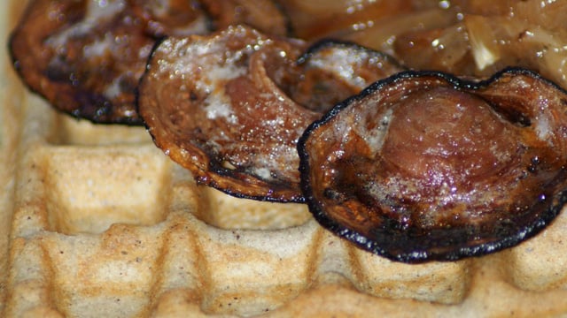 Cuire les gaufres 3'. Les réchauffer dans une poêle avec du beurre 1/2 sel, 1' sur une face, puis les retourner, les garnir de compote d'oignons et d'andouille.