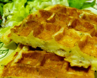 Mélanger les pommes de terre avec le fromage, les herbes, le sel et le poivre, les oeufs et la farine jusqu'à ce que la pâte à gaufre soit homogène.