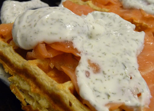 Dés que les gaufres sont prêtes et encore chaudes, mettre une tranche de saumon fumé et ajouter par dessus la sauce à l'aneth. C'est prêt, un vrai régal pour toute la famille.