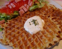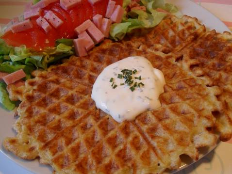 - - Râper les pommes de terre et les presser fortement entre les mains pour enlever le maximum d'eau.- Mettre les pommes de terre dans un saladier et ajouter la crème, les oeufs et la farine. Remuer et assaisonner.- Cuire les gaufres et déguster tiède...