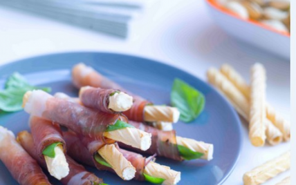 Déposez une petite feuille de basilic dans une lamelle de jambon de Parme.