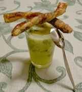Dans un verre mettre l'ananas en dés au fond, racler un peu de granité, verser le gazpacho bien frais et finir avec quelques paillettes de menthe.