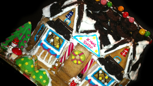Utiliser le glaçage pour fixer les éléments biscuités et bonbons, et en colorer une partie pour d'autres décos: du vert pour des guirlandes végétales sur les rebords des fenêtres, la coloration en vert du sapin, des moulures colorées en bleu autour des fenêtres, des montants de la structure en blanc, des rubans avec du rouge ... Pour la tonnelle avec le nom 'Xmas Shop', j'ai commencé par badigeonner avec le plat d'un couteau de blanc la face, j'ai bien laissé séché, et écrit au cure dents trempé dans du glaçage coloré rouge le nom ! J'ai ensuite inséré des mini décos de noël: bonshommes de neige, casse noisettes, ours, angelots, et champignons pour parfaire le décor !