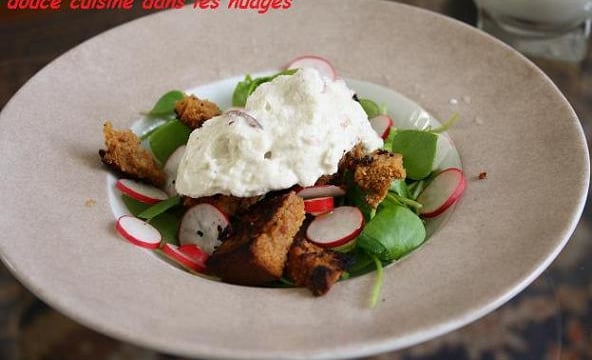 Dresser: salade de pourpier, radis assaisonner de vinaigrette puis croûtons de pains d'épices et enfin une quenelle de glace au roquefort.