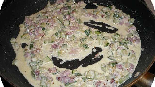 Le temps qu'ils cuisent, rallumer le feu (doux) sous les légumes, ajouter la crème fraîche et le piment.