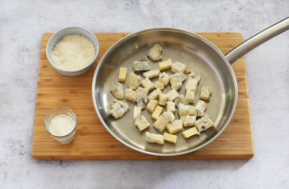7Mettez le beurre et les dés de gorgonzola dans une poêle anti-adhésive. Ajoutez le parmesan râpé et la crème. Salez et poivrez.