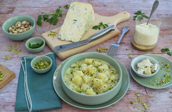 Des délicieux gnocchi faits maison, sublimés par une sauce à base de Gorgonzola AOP et pistaches grillées salées. Un plat original et savoureux.