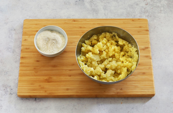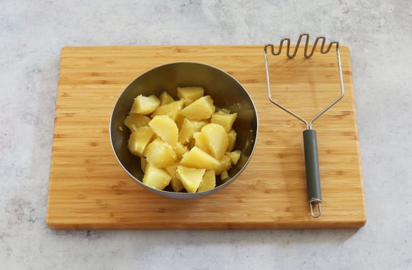 2Épluchez les pommes de terre encore tièdes et écrasez-les dans un saladier à l'aide d'un presse-purée.